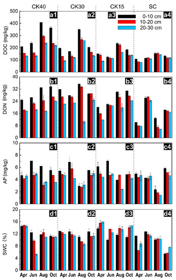 Soil dissolved organic carbon (DOC, a1–a4), dissolved organic nitrogen (DON, b1–b4), available phosphorus (AP, c1–c4), and water content (SWC, d1–d4) in different soil layers (0–10, 10–20, and 20–30 cm) under different land-use types in four months. Each bar has nine replicates (three sample lands × three replicate plots). The error bar is the standard error. CK40, CK30, CK20, and SC represent 40-, 30-, and 20-year old Caragana korshinskii Kom. lands and slope cropland, respectively. The detailed ANOVA results of the significant effects of the different treatments on the soil properties are shown in Table S1.