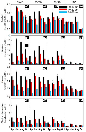 Soil enzyme activities (catalase, a1–a4; sucrase, b1–b4; urease, c1–c4; and alkaline phosphatase, d1–d4) in different soil layers (0–10, 10–20, and 20–30 cm) under different land-use types in four months. Each bar has nine replicates (three sample lands × three replicate plots). The error bar is the standard error. CK40, CK30, CK20, and SC represent 40-, 30-, and 20-year-old Caragana korshinskii Kom. lands and slope cropland, respectively. The detailed ANOVA results of the significant effects of the different treatments on the soil properties are shown in Table S2.