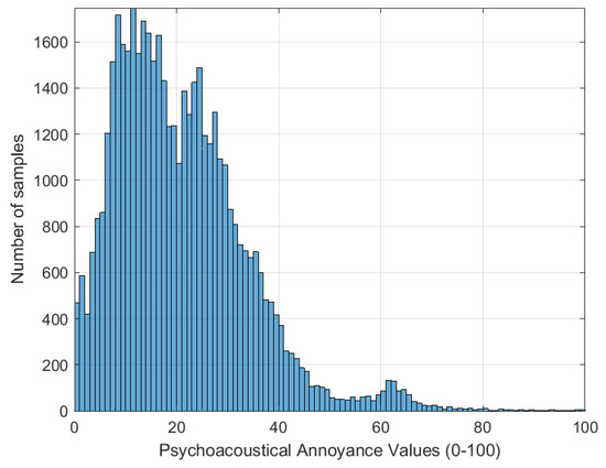 The considered audio signals used in this work belong to the UrbanSound8K database [15], consisting of 8000 tagged audios following a taxonomy similar to the one described in ISO 12913-2 [14] for urban sounds. Please note that in our case we are not especially interested in the labels, as we do not intend to recognize audio classes. All the files with a length greater than 1 s were considered and split to obtain a total of 59,000 one-second audio segments. The files were originally recorded with different sampling frequencies from 8 kHz to 48 kHz. This database was extended with 1150 s of recordings in different cities and areas, resampling all the final segments to 16 kHz. Finally, the whole database with 60,150 audio segments was divided into three datasets for training, validation, and test. To this end, we extracted randomly 1000 audios to generate the test dataset. The remaining 59,150 signals were used for training (80%, 47,320 signals) and validation (20%, 11,830 signals). For all the audio segments, we extracted by direct computation their corresponding PA value, to use the computed values as ground-truth annoyance during the training and validation of the system. Since calibration information is missing, we assumed a standard mapping to SPL as typically performed in audio coding. Bearing in mind that PA values range from 0 to 100, proportional to unpleasant to extremely annoying sounds, it can be observed in the histogram shown in Figure 1 that most audio segments in the database have PA values in the range going from 0 to 50, so higher accuracy is expected to be achieved by system in this range.