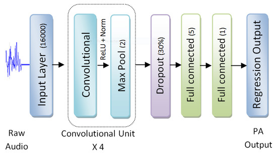 As discussed in the previous section, an alternative tool to the direct computation of the psycho-acoustic metrics is needed to perform real-time PA evaluation within an IoT node. In recent years, deep neural networks (DNNs) have been extensively used to solve a wide range of problems related to audio signal processing, such as audio event detection [21,22,23], source separation [24] or source localization [25]. In this context, CNNs have been shown to be a powerful tool for many audio-related tasks, with internal layers that are able to learn optimized features capturing those signal properties that are relevant to solve the task at hand. In this work, we propose to train a CNN to solve a regression problem, where raw audio windows are provided as input, receiving as an output the predicted PA value. To this end, the PA ground-truth values used for training are obtained by direct computation, as described in Section 2.