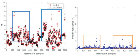 PA calculated vs. CNN prediction (left), CNN prediction error (right) using test dataset. Areas marked with high PA values where the highest prediction errors are located.