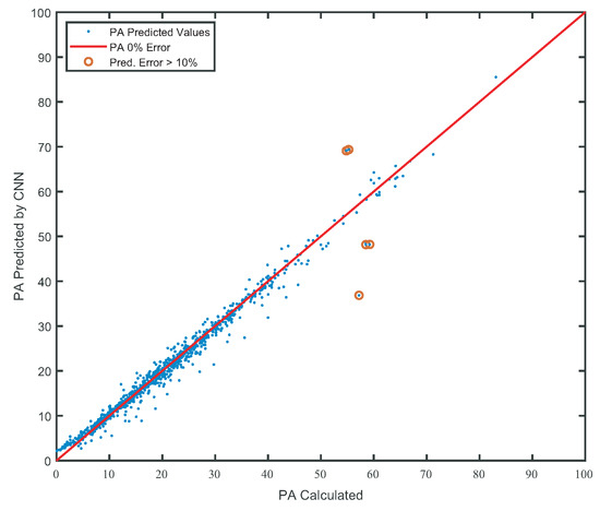 PA Calculated vs. PA Predicted by CNN. Predicted PA values with Error > 10% marked.