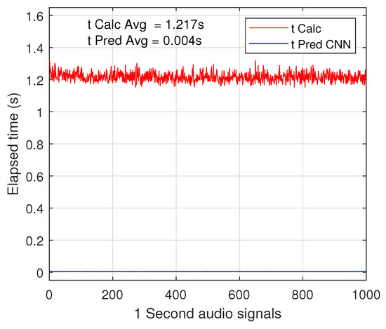 The time used by CNN to predict the PA value (blue) from raw audio signals is significantly smaller than the one obtained by direct calculation (red). The average time for CNN prediction is 0.004 s while for direct calculation is 1.217 s. Thus, a speedup higher than 300 is achieved by the proposed CNN-based system. It can also be observed that the times obtained from the CNN are almost constant while the times obtained by direct calculation depend on the complexity of the input sound. All these results confirm that the proposed CNN model is a good candidate for IoT-based implementations, where the PA analysis can be comfortably performed in real time with a computation time much smaller than 1 s.
