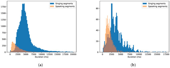 Distribution of singing and speech segment durations. (a) Bertsolaritza database; (b) NUS database.