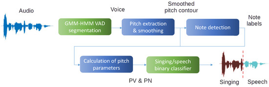 - Sarasola, X.; Navas, E.; Tavarez, D.; Serrano, L.; Saratxaga, I. Speech and monophonic singing segmentation using pitch parameters. In Proceedings of the IberSPEECH 2018, Barcelona, Spain, 21–23 November 2018; pp. 147–151. [Google Scholar]