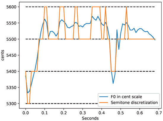 In a cent scale, a smoothing is applied to the pitch curve to neutralise vibrato variation within the notes. The smoothed curve is created averaging interpolation curves of local maxima and minima. Then, the smoothed curve is discretised to the closest ideal semitone as shown in Figure 3. As a result of this process, the real smoothed curve (in blue) is substituted by the discretised curve (in orange).