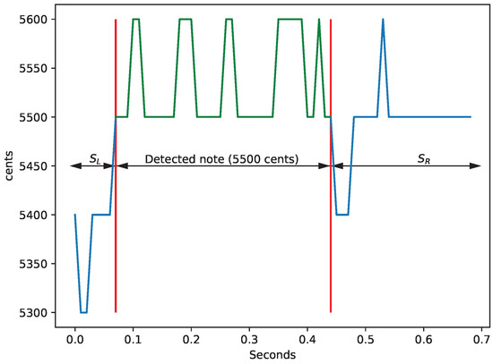 To detect notes in the discretised curve, we apply an algorithm that uses subsequence search techniques [30,31]. We search sequences in the discrete curve that fulfil the minimum conditions of length and stability defined in expressions (3) and (4):