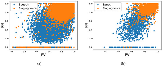 Figure 5a,b show the distribution of the proposed classifying features and in Bertsolaritza and NUS databases. In both cases, speech presents a more scattered distribution than a singing voice. However, good discrimination can be achieved when considering both parameters at the same time. As a final step of the proposed algorithm, a classifier has to be trained with the vector containing these two parameters to obtain the final speech/singing classification.