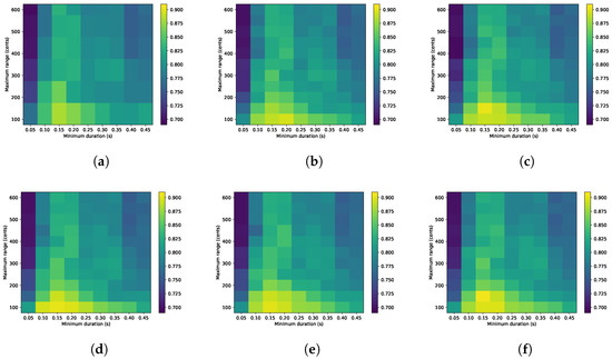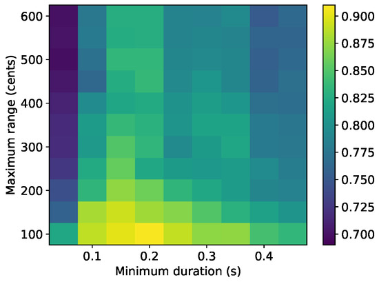 Figure 6 shows that, when the note algorithm parameters get closer to the values common in Western music [34] (minimum duration in the range of 100–200 ms and maximum pitch range between 100 and 150 cents), the discrimination between singing and speech improves. This means that the optimum value for the parameters has a strong relation with the style of singing that we want to discriminate from normal speech. The vertical resolution in Figure 6a is half of the resolution shown in the rest of the cases because one step per semitone does not allow for having different results between semitones.