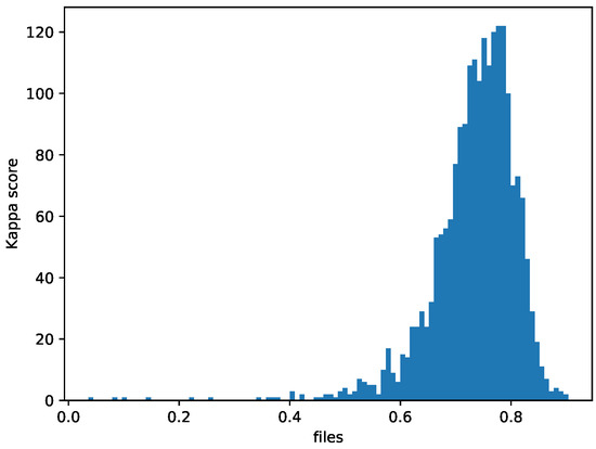 Histogram of kappa score between notes detected by Tony and our algorithm.