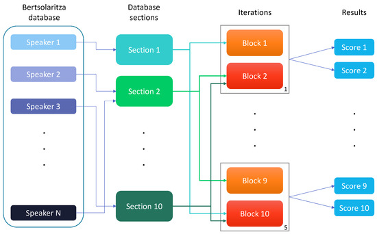 We have used the 5x2cv paired t test [41] with the structure shown in Figure 9 to compare the systems. To achieve this, we split the Bertsolaritza database in 10 sections with the only condition that all the segments of each speaker had to be in a single section. After this, we made five iterations of splitting the database in two blocks of five random sections with no block repetition. In each of the iterations, we created a first score by using one block as train and the other as test. A second score is calculated by rotating test and train, training set becomes test and vice versa. This gives us 10 scores in total (two per iteration) that are used to calculate the means and variance values presented in Table 4 and Table 5 and the p scores in Table 6. The procedure ensures that no speaker is present both in training and test block in any iteration.