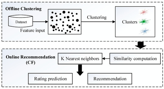 Existing literature has addressed the improvement of the CF algorithm through clustering analysis. For example, in Reference [41], users are grouped into clusters to find a match between the target user and each user group. Figure 1 illustrates a two-phase strategy for a recommendation based on clustering techniques, which consists of two phases, i.e., offline clustering and online recommendation. Before making rating predictions according to neighbors, users or items are aggregated first to form clusters, from which the nearest neighbors are determined through similarity calculation. Once clusters of the target user are determined, rating predictions can be made in view of the ratings of nearest neighbors of the small-scale clusters in the phase of online recommendation. In this way, the computational complexity of the CF algorithm is optimized.