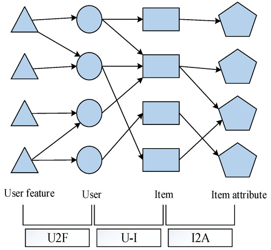 Information of a recommendation system consists of data of users and items, including user features, item attributes, and the relation of user and item. A recommendation system involves users, items, and their relations. Here, relations refer to user behaviors on items, such as searches, purchases and ratings. User features refer to the basic user information submitted during the user registration process. Item attributes include all the information about an item. As indicated in Figure 2, there are three kinds of relations in the recommendation system: user-user feature (U2F) relation, user-item (U-I) relation, and item-item attribute (I2A) relation.