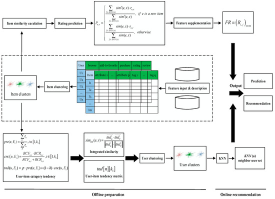 The proposed HTPR method consists of two phases: offline preparation and online recommendation, as shown in Figure 3. Firstly, in order to achieve a high-quality recommendation effect, we consider both item features and user behaviors in the process of feature input and description. Secondly, to explore effective recommendation techniques with good capability of dealing with massive data, a parallelized execution strategy was designed to optimize the recommendation process. After item clustering, feature supplementation and user clustering were carried out in a parallelized way. A brief introduction of the key components and concepts of the proposed HTPR method is given in the following: