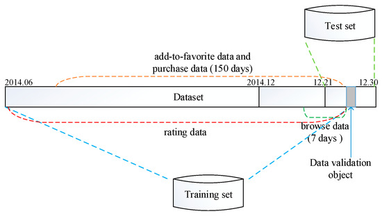 To make a comparison, the dataset was divided into a training set and a test set. As shown in Figure 4, the test set took from the data of 21–30 December 2014, from which data of one certain day were selected as the data validation object. On the other hand, the training set consisted of browser data of 7 days, add-to-favorite data and purchase data of 150 days, and all rating data before the selected day. Based on the training set, each user was recommended with several items, which will be compared with the data in the test set.