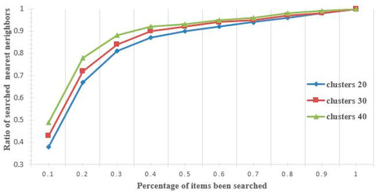 (1) Validation test on item clustering. In the first experiment, the effectiveness of the item clustering was examined by measuring the search efficiency of nearest neighbor items. Specifically, the 1628 items in the dataset were clustered under the circumstances of 20 nearest neighbors. We analyzed the impact of different clusters (20, 30, 40) on the search efficiency, the results are shown in Figure 5. Y-coordinate denotes the ratio of searched nearest neighbors of items, and X-coordinate denotes the percentage of items that have been searched.