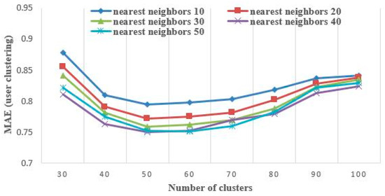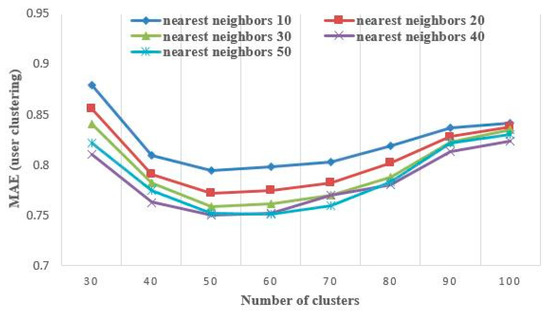 Overall, as shown in Figure 8, MAE values decreased first and then rose with the increase in the numbers of clusters. As shown in Figure 8, the lowest MAE appeared with 0.75 when the clusters were 50 or 60; the MAE values were relatively lower with 0.85 when the nearest neighbors were 30, 40; all the curves dropped to their lowest points when the number of clusters was 50. Thus, in the following experiments, the number of clusters for user clustering was chosen as 50, while the number of nearest neighbors was indeterminate, which can be 30 or 40.