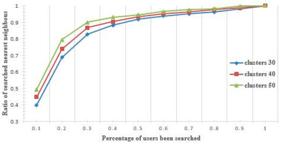 The results are similar to that of item clustering. When the percentage of users being searched increased, the ratio of searched nearest neighbors increased. Through user clustering, more nearest neighbor users can be found within fewer search spaces; the greater the number of clusters was, the higher the search efficiency was.