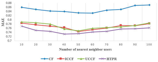 Figure 10 shows the MAE values of CF, ICCF, UCCF and HTPR. It can be found that the MAE values of ICCF, UCCF and HTPR were much lower than CF. In addition, the MAE value of HTPR was the lowest, the curve of HTPR shows down first and then up, and the MAE achieved a lowest value 0.732 when the number of nearest neighbors was 40. Thus the proposed HTPR method was proven to provide more accurate predictions than CF, ICCF and UCCF.