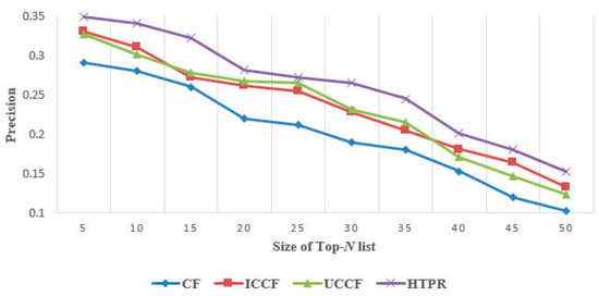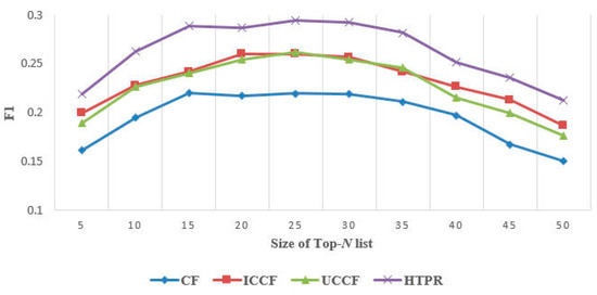 Figure 11, Figure 12 and Figure 13 show the precision, recall and F1 values of Top-N (N ranged from 5 to 50 with a step of 5) recommendation list of CF, ICCF, UCCF and HTPR. The Y-coordinate respectively denotes the precision, recall and F1 values, and the X-coordinate denotes the number of items in recommendation list, i.e., N. It can be found that the precision values decreased when N increased, while the recall values increased when N increased. The F1 values went up first and then down when N increased. Besides, the precision, recall and F1 values of HTPR were comparatively higher than those of CF, ICCF and UCCF. It can also be noticed that when N = 25, the proposed HTPR method achieved the most accurate quality of recommendation.