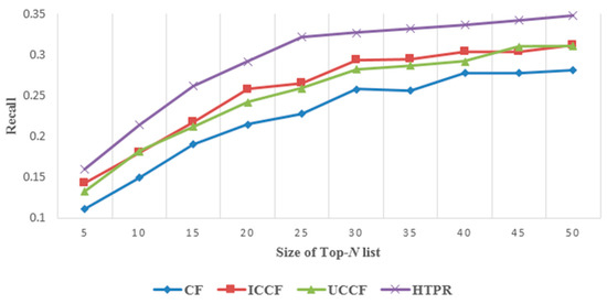 Comparison of CF, ICCF, UCCF and HTPR in Recall.