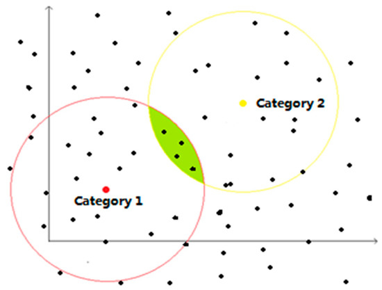 - Traversing all the samples in the sample dataset. All the samples belonging to category “1” are required to have a distance to less than , and the distance to greater than . At the same time, all the samples belonging to category “2” are required to have a distance to less than , and the distance to greater than . Samples that do not meet the requirements are rejected. Then, the new training set is = {, …, }, , , and Figure 3 shows the case when the number of clusters is 2 and 2 dimensions in the sample.