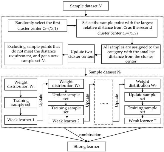 | Input: | Sample set = { , …, }, , ; Number of cluster categories K; Distance parameter , , …, ; Maximum sample distribution rate F; Number of weak learners T; Base learning algorithm ; sum = 0. |