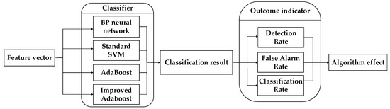 - To compare the performance of each classification algorithm, three evaluation indexes, namely Detection Rate (DR), False Alarm Rate (FAR), and Classification Rate (CR), are defined. The classification results of BP neural network, standard SVM network, AdaBoost, and IAA are evaluated, respectively. The superiority of the IAA is reflected by comparison.
