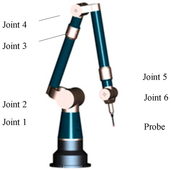 Traditional articulated arm coordinate measuring machines (AACMMs) are widely used in industrial fields based on their portability, wide measuring space, and low cost. The key technologies of articulated coordinate measuring machines were instrument structure, error analysis, measurement model, eccentric error correction of circular grating installation, development of standard components for parameter calibration or performance evaluation of AACMM, optimization of parameter calibration algorithm, etc. [1]. Methods for improving the accuracy of AACMMs largely focus on kinematics modeling and the calibration of structural parameters [2,3,4,5,6,7]. AACMMs have complex error performance. The structural parameter error of AACMMs cannot be avoided in the manufacturing process. It is necessary to identify the structural parameters through parameter calibration to enhance AACMMs measurement accuracy. A kinematic calibration procedure normally consists of four steps: determination of the kinematic model, data acquisition for calibration, parameter identification using calibration data, and experimental validation [8]. The Denavit-Hartenberg (DH) approach or the modified Denavit-Hartenberg (MDH) approach is widely employed to establish a kinematic model [9,10,11,12]. The coupling relationship between kinematic parameters was considered and obtained via the singular value decomposition before the identification and compensation models were established [12]. Quaternions are another way of describing rotation in three dimensions. Battista et al. [13] introduced a kinematic model established by quaternions. Data acquisition is carried usually out by using various artifacts, for example, a 3D artifact [14] was composed of 14 reference points with three different heights, another example was a kind of ball bar used for length reference that calibration tests were carried out in larger space by changing ball bar pose [7,11]. Acero R. et al. [15] used a laser tracker as a reference instrument for AACMM calibration and verification procedures. The technique increases the flexibility for defining test positions. In general, parameter calibration is performed using a mathematical method to process the sampled data. It is important to select optimization methods. Cheng et al. [8] compared the nonlinear least method, genetic algorithm method, and simulated annealing method. Experimental results show that nonlinear least square method is very suitable for parameter identification of AACMM and is widely used [10,11,12,13,16]. The sampled data was processed for the exclusion of rough error [11]. Interior point method was used to identify the structural parameters of AACMM and has no requirement on the iterative initial value, which can effectively improve the success rate of parameter calibration [17].