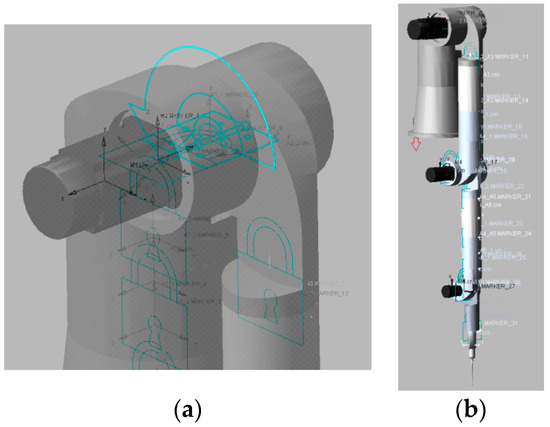 First, the Joint 1 input was fixed to the ground. We then attached a fixed hinge to the ground and added a rotating hinge for Joint 2. The axis of rotation was set to the center axis of the motor, and the remaining joints were connected using another fixed hinge, as shown in Figure 6a. For Joint 2, regarding MSC Adams hinge motion (joint motion), a column shape was selected for rotational motion. The selected shape was then added to a rotating hinge, and the added drive property was edited to ensure constant angular acceleration. To accomplish this, the property type was set to acceleration, and the angular acceleration value was set as 10°/s2 (0.1745 rad/s2). The rest joints were locked with fixed hinges, and the initial pose of the model simulation is shown in Figure 6b.
