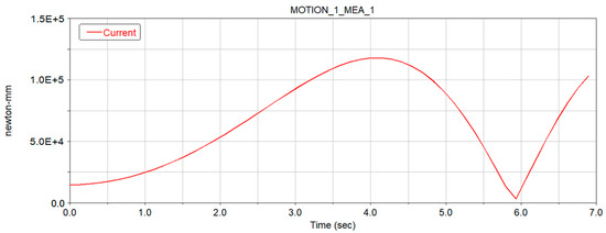 We set the simulation time to 6.9 s, meaning Joint 2 will rotate from 0° to 240°, and set the compensation to 100 steps to complete the simulation. The simulated moment curve is presented in Figure 7, where the maximum moment is 118.11 N·m.