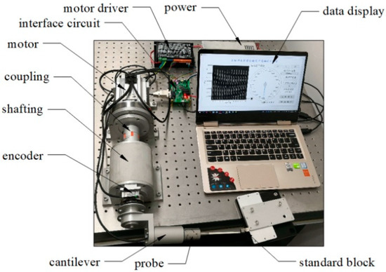 Joints are the key components for machine movement control and measurement. Therefore, it was necessary to construct a single-joint experimental setup to verify the proposed design before constructing an entire machine. This single-joint experimental setup is presented in Figure 8. The interface circuit controls the motor and drives the rotation of the shafting, cantilever, and trigger probe. The probe can touch the upper and lower sides of a standard block fixed in an optical platform. Once the probe sends a trigger signal, counting data for the encoder will be sampled and uploaded to the computer for data storage and analysis.