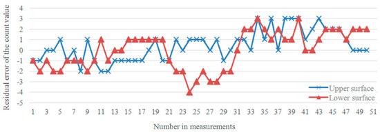 Repeatability tests with different rotational velocities were carried out using the single-joint device. Speed was controlled using pulse width modulation (PWM). After receiving the start signal, the measurement and control circuit of the joint sent the PWM signal to the motor and controlled the arm to rotate until the probe touched the surface of a measuring block and triggered angle measurement. The counter value was collected and uploaded to the computer at this time. Then, the arm was controlled to rotate reversely until the probe touched the other side of the measuring block, and the angle measurement was taken once again. The process was repeated 50 times without interruption at each duty ratio of PWM. As an example, Figure 9 presents the residual error in the count value when measuring both sides of the block with a speed of 0.67 rad/s (PWM = 6%). Table 5 lists the variance values from the repeatability experiments, where σU and σD represent the standard deviations when touching the top and bottom of the standard block, respectively.