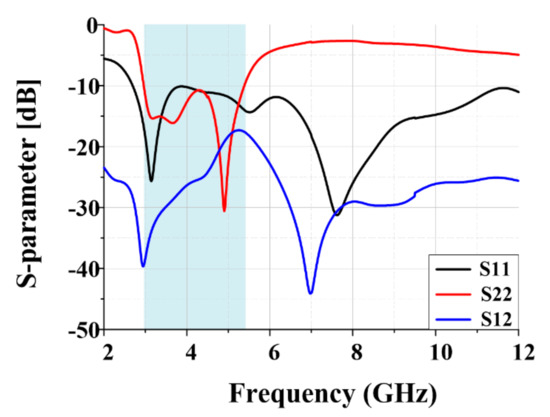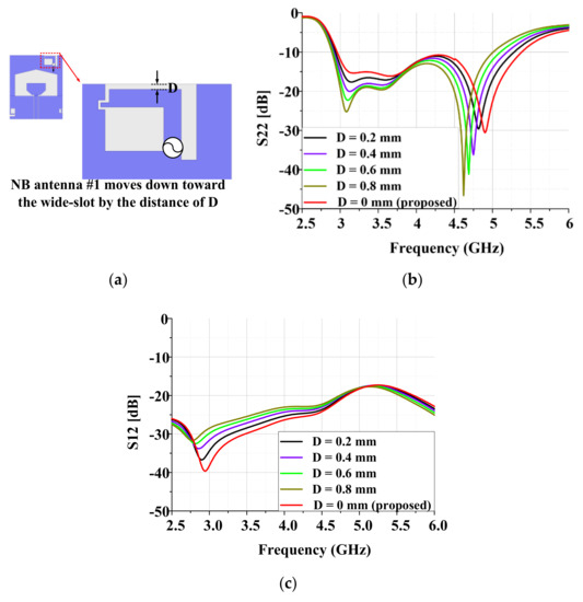 | Ref. | Dimensions [mm × mm × mm] | Number of NB Antennas | Communication in the Entire UWB Band | Method of Isolation | Minimum Isolation |
