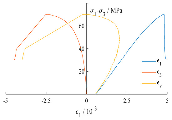 This research focused on the stress state of rock specimens during the loading process under various hydrostatic pressures. Based on the test data, Figure 4 depicts the stress–strain curves of siltstone specimens in the conventional triaxial compression test at a confining pressure of 10 MPa, wherein is the axial (lateral, volumetric) strain of siltstone specimens which occurred under the load.