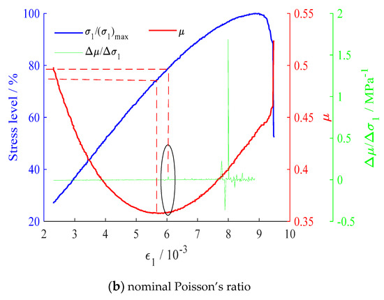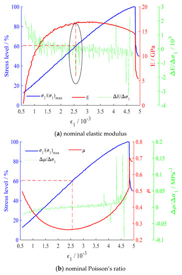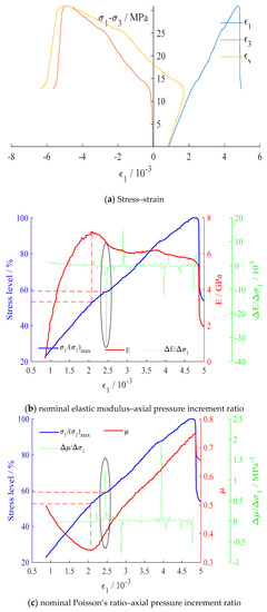 - The nominal Poisson’s ratio changes highlight a U-shaped pattern while increasing axial pressure, namely first decreasing and then increasing. In contrast, the change of elasticity modulus shows an opposite trend. At a fixed confining pressure, the critical point of change in these trends corresponds to equal or similar stress levels;