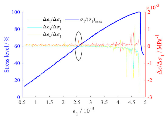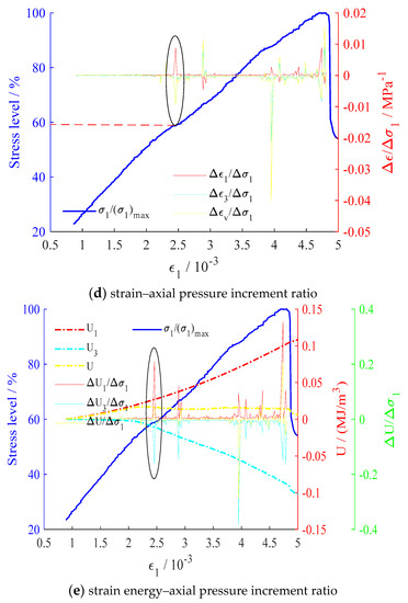 The overall change of the strain–axial pressure increment ratio was not pronounced (Figure 6). Nonetheless, according to the stress level at which the elastic-plastic threshold appeared, evidently the first relatively pronounced change occurred at the 60.17% stress level. This result further confirms the rationality of the elastic-plastic threshold we have selected.