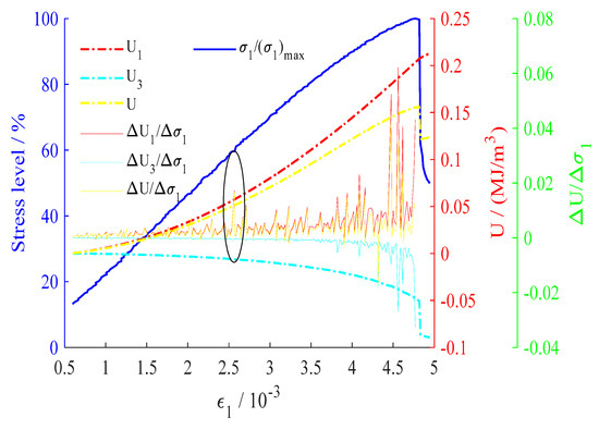 The example of axial strain energy (Figure 7) shows a pronounced increase in the rate of change at the 60.17% stress level. In other words, the strain energy–axial pressure increment ratio demonstrates the first pronounced change at this level, which is consistent with the stress level corresponding to the elastic-plastic threshold.
