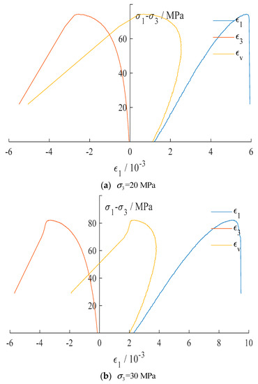 To demonstrate the relationship between confining pressure and unloading level, the stress–strain curves of siltstone during loading at confining pressures of 20 and 30 MPa (Figure 9) are provided below.