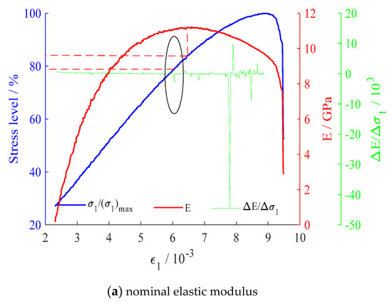 Under the conventional triaxial compression, , Equations of nominal elastic modulus and nominal Poisson’s ratio for the deformation parameter of rocks [28,29] are formulated below by substituting , into Equation (1), that is: