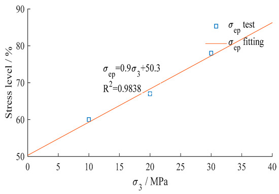 When the confining pressure is at 10 MPa, the stress level , is expected to correspond to the threshold for an inflection in the deformation parameter, indicating whether a rock is damaged or not. The stress level exhibits an approximately linear relationship with the confining pressure (Figure 12). The fitted formula is expressed as