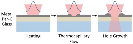 The process is diagramed by Figure 1, where the dewetting event is separated into three main regions: heating, thermocapillary flow, and hole growth. The choice of laser wavelength, flux density, target material, and substrate material all play a large role in the viability of this technique to effectively create dewetted structures without damaging the underlying substrate. This is of particular importance when using polymer substrates with metal targets, since the melting point of the metal film is so high.