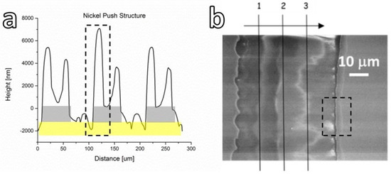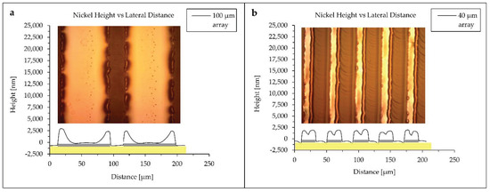Optical micrographs (upper) and profilometry (lower) of Ni digits for pitch lengths of (a) 100 µm and (b) 40 µm. Optical micrographs have been aligned with the profiles for comparison. Yellow shading has been used to demark the polymer substrate in the profile; grey shading has been used to demark the native Ni-film layer.