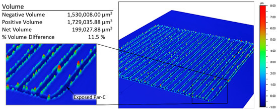 In the case of short-pitched laser scans, higher concentrations of heat accumulate, expose the Par-C to higher peak temperatures, and lead to the deformation observed in the 40 µm pitch vs. the 100 µm pitch. Increasing the wait time between the laser passes, or alternating the scans may provide a greater amount of cooling; however, a more effective solution would be to use a lower power setting beyond the capabilities of the present laser system.