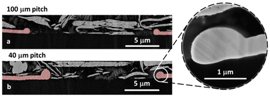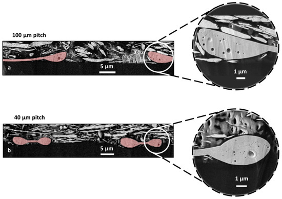 The solidification of the dewetted and displaced nickel occurs underneath the remaining film. The partial delamination of the film at the edge of the laser path can be observed in Figure 4a, but it is unclear whether the delamination occurs before or after the melting occurs. This results in bead formation underneath the film rather than on top—a sharp contrast to the morphology of other dewetting thin film examples [20,37]. No films other than the Ni films exhibited the same type of inverted dewetting, nor did any films exhibit delamination to the same extent. Other films containing some portion of Ni are discussed below, showing some delamination immediately adjacent to the laser path. As the pitch is lowered to 40 μm in Figure 4b, the dewetted bead becomes nearly symmetrical around the non-melted film to form a “dumbbell” cross-section created out of two adjacent laser scans. The unprocessed film in between the 40 µm pitch ridges is also delaminated and, due to the small pitch, it extends all the way across to the next ridge formation. The ridges themselves appear to stay adhered and reside in small indentations within the Par-C surface that were most likely created during the dewetting action. Both cross-sections also exhibit a sub-micron porosity formed in the ridges of the dewetted material. No other investigated material exhibited such a porosity. The voids that are observed in both sets of Ni linear arrays most likely arise from the degradation or outgassing of the polymer at the interface, as no voids are visible in the original, non-dewetted and displaced Ni film. The gas evolution from the surface of the polymer may play an important role by protecting the Par-C from the intense heat of melting Ni through the presence of a thermally insulating gas, similar in consequence to the Leidenfrost effect [38]. In addition, the gas formation may be responsible for the aforementioned “delamination” of the film from the surface prior to melting. In the future, it would be of interest to observe and possibly verify this process through an in-situ characterization.