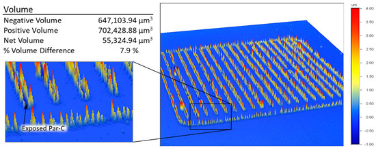To prove that Ag was displaced, as opposed to being ablated, an accounting of the film volume was achieved using profilometry (Figure 6) in a similar way as shown for Ni (Figure 3). The accounting of the displaced volume (Figure 6) reveals that only 7.9% of the excess positive displaced volume is left unaccounted, proving a displacement via dewetting vs. that of an ablation process. The 7.9% discrepancy may be explained by small shadowing effects created by the aforementioned spherical accumulations along the dewetted Ag ridges, as well as the measurement variation of the profilometer and/or ablation of a small amount of Par-C.