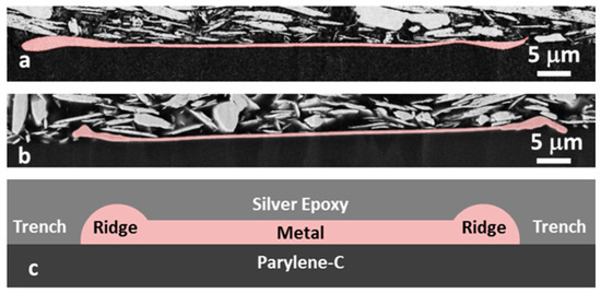 The cross sections of the dewetted Ag digits are presented in Figure 7. Unlike the previously described Ni film, the dewetted ridges show no signs of porosity within the beads formed by the displaced material or film delamination. The absence of the pores may be a result of the lower melting point and higher thermal conductivity of the Ag relative to Ni, thus reducing the heat load on the underlying substrate and reducing vaporization at the metal-polymer interface. Furthermore, the increased thermal conductivity quickly dissipates the high heat concentration at the exposure point, leading to less substrate degradation. Like the pure Ni films, there is no visible destruction of the Par-C substrate—even in the face of a much higher laser intensity.