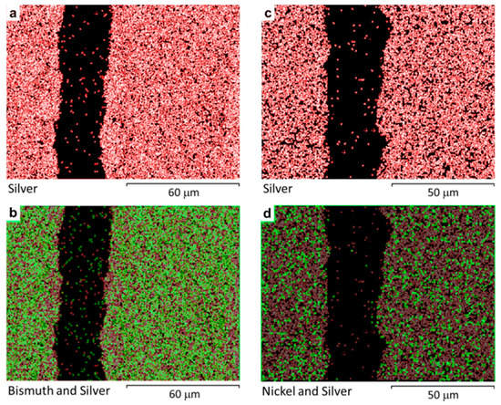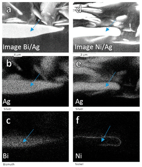 To verify the bulk distribution of the metals after the dewetting and subsequent displacement, similar EDS maps were performed on the cross sections of the metal displaced in the form of the “ridge”. In the case of the Bi-coated sample, the Bi top film is incorporated within the bulk of the displaced metal, as clearly seen in Figure 10c. The low Tm Bi film will melt first, and according to the phase diagram the Bi-Ag system exhibits a small degree of Bi solubility in Ag above 175 °C [43]. As the processing induces very fast cooling rates, it could be that a limited degree of Bi solubility in Ag occurs through super-cooling.