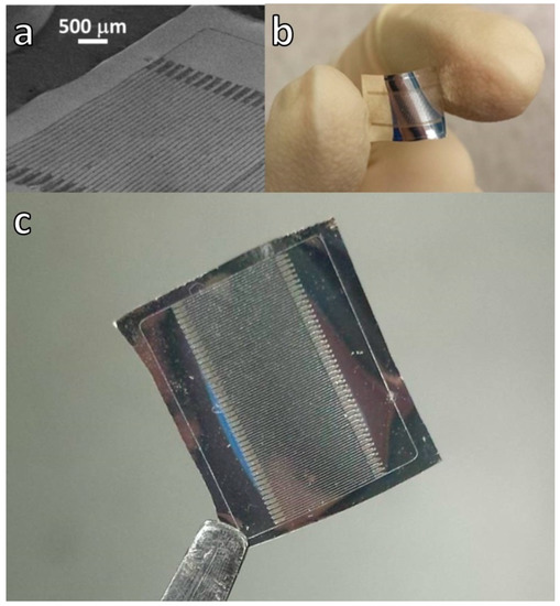 Ultimately, the advantage of using the scan-system in the dewetting process manifests in the ability to quickly fabricate complicated and free-form shapes, such as one would want for microelectrodes or microfluidic channels. To demonstrate such effectiveness, inter-digit electrode (IDE) pairs were both patterned into single-layer sets of films. By measuring the electronic resistivity between the two electrodes, we can characterize the extent to which dewetting occurs, while also demonstrating a moderately complex pattern design. Figure 11 presents an example of such an IDE created in Ag films. Each electrode was connected to 45 inter-digits, with 30 μm spacing and an 80 μm width. The spacing between the digits represents a single pass of the laser. The resistance within the unprocessed area was measured using an ohmmeter at various points throughout the film prior to processing to establish the film’s connectivity. After processing the film into the dewetted IDE, two-wire resistance measurements across the two electrode pads generated values > 1 G-Ohm. Therefore, it is concluded that the dewetting action proceeds completely and does not leave any percolated conductive metal or by-products. The EDS maps presented in Figure 9 also confirm the lack of any significant amount of residual metal within the trench area after processing. An inspection under an optical microscope and under SEM (Figure 11a) appeared to show that all the inter-digits were continuous; however, electrical conductivity was not confirmed via direct-measurement due to the small size of the features. The lift-off of the Par-C polymer substrate from the glass slide backbone produced an IDE patterned onto a flexible, free-standing polymer, as seen in Figure 11b,c.