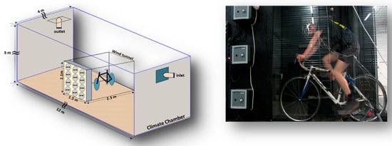 During the course of these experiments, 15 male test subjects with an average age () of 22 (±1) years and an average weight () of 74.3 (±9.2) kg were used in this study. The experimental protocol was approved by the Social and Societal Ethics Committee (SMEC) of KU Leuven. The experiments were conducted using a professional bicycle trainer (Tacx Ironman Smart) with a fastened racing bicycle (BH L52C8 Speedrom) controlling the power delivery of the subject with a power brake. The power brake itself was wirelessly controlled via the Tacx Trainer software. The bicycle trainer was placed in a customised wind tunnel to simulate the wind effect on the test subjects during the course of the experiment (Figure 2). The wind tunnel was 2.1 m high, 2.3 m long and 1.5 m wide. Four rows with three fans each (Fancom type 1435/L7-588 fans) were used as the actuators for wind speed. Each fan produced a maximum ventilation rate of 3000 m3·h−1. A 50 cm long honeycomb gauze structure, placed 25 cm from the fans, was used to obtain a quasi-laminar flow within the open-loop wind tunnel (for more information about the wind tunnel, see []). The air speed near the test subject’s head was set to 2.5 m·s−1 to simulate recreational cycling for adults and children. The wind tunnel was placed inside a climate-controlled chamber (Figure 2), the inner dimensions of which were 4 × 11 × 5 m (××). The air temperature within the climate chamber was controllable within the range of 15–35 °C. Additionally, the ventilation rate within the climate chamber was controllable within the range of 0–2700 m3·h−1 (i.e., 0–11.25 volume refreshments per hour).